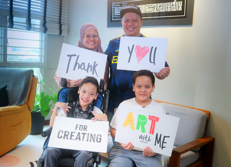Twins Rizq Nawfal Bin Hambril, from Cerebral Palsy Alliance Singapore School, and Qays Naushad Bin Hambril, are the artists who inspired one of the canvas outlines for 2023’s Paint It Forward art jam. Here with their parents Mdm Nur Hidayah Shahrudin and Mr. Hambril Burham.